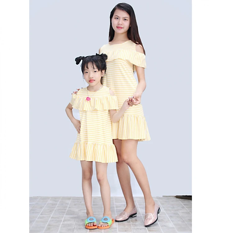 Set Đầm Suông Hạ Eo Phối Bèo Vai Cho Mẹ và Bé - Sọc Vàng
