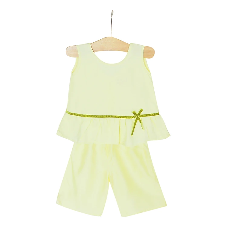 - Set đồ bộ gồm áo sát nách và quần lửng. Phần áo có đính nơ xinh xắn, hàng nút trước ngực tạo điểm nhấn cho sản phẩm, quần lửng lưng thun tạo cảm giác thoải mái cho bé khi mặc.