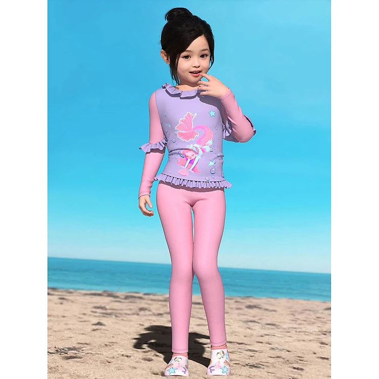 Set đồ bơi 2 chi tiết gồm áo bơi dài tay và quần dài cho bé gái nàng tiên cá tím phối bèo xinh xắn