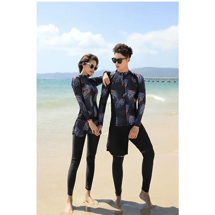 Set đồ bơi dài tay đôi nam nữ hoa lá 5 mảnh chống nắng. Bộ nữ gồm 5 mảnh: áo khoác dài, áo croptop (dạng áo tập) bên trong, quần tam giác, quần đùi và quần dài. Bộ nam có 3 mảnh gồm áo khoác dài, quần lửng và quần legging như mẫu mặc. Chất thun bao đẹp, đường may chắc chắn, màu áo cực nét.