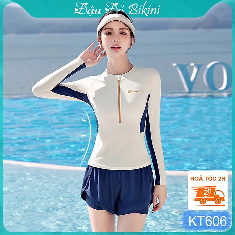 Set Đồ Bơi Nữ Dài Tay Chống Nắng UV Đa Năng, Áo Bơi Khóa Kéo Trước Vải Co Giãn Cao & Quần Đùi Bơi 2 Lớp Nhanh Khô, Thời Trang Trẻ Trung, Dễ Mặc | KT606