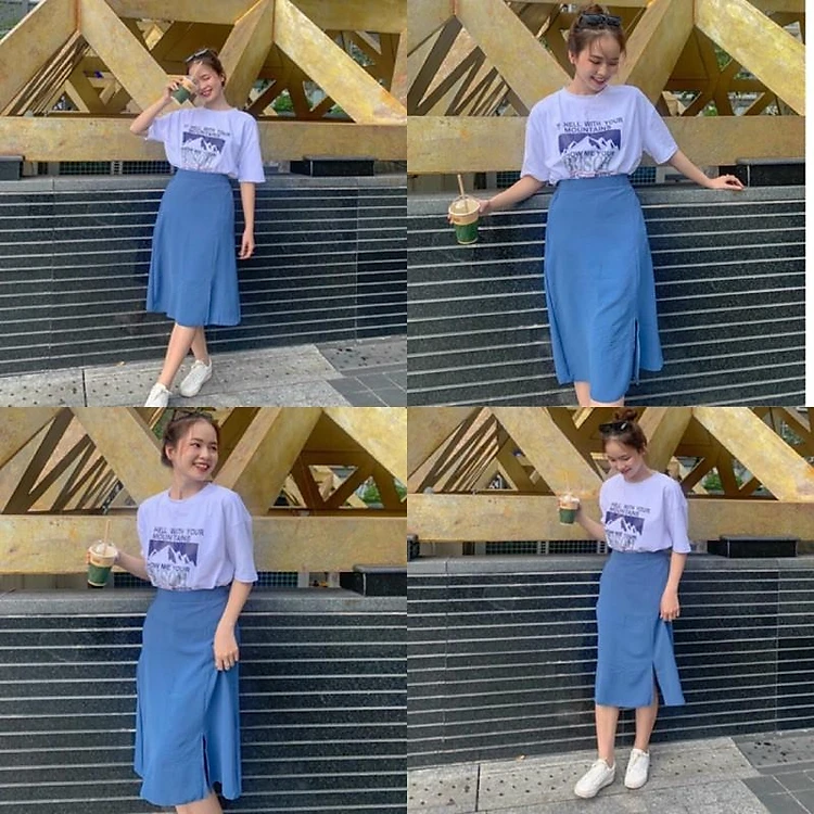 Set Đồ CIRCLE SET thiết kế áo thun trắng form rộng mix với chân váy dáng dài xẻ tà màu xanh