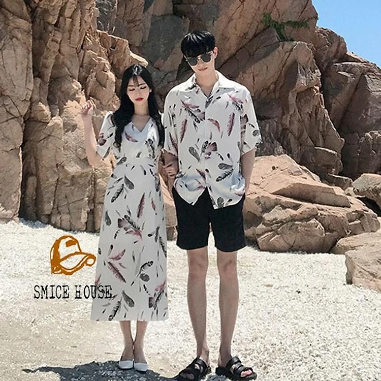 SET ĐỒ ĐÔI NAM NỮ, ÁO CẶP HOA LÁ ĐI BIỂN PHONG CÁCH HÀN QUỐC ÁO SƠ MI ĐẦM MAXI