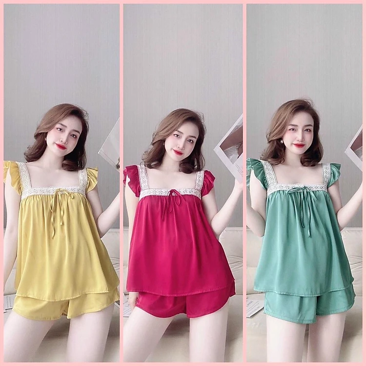 sét đồ ngủ 2 tay cánh tiên phối ren quần đùi, đồ bộ satin cao cấp