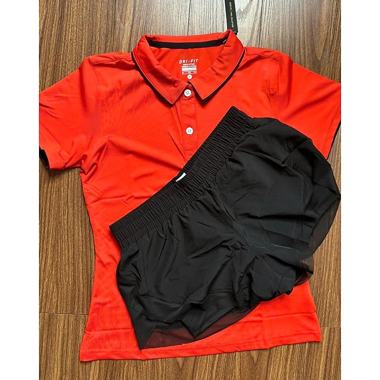 Set đồ nữ gồm áo thun cổ trụ và quần đùi 2 lớp phong cách thể thao sang trọng