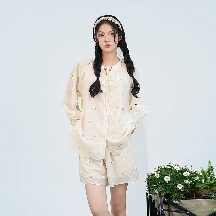 Set đồ nữ thêu hoa gồm áo dài tay kèm quần short phong cách vintage Aster Miều Est.2013