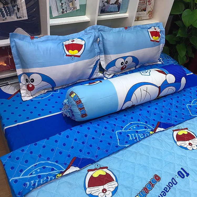 Set Ga Gối 3 Món Cotton Poly Hình Đô Rê Mon MSP: CH23 + Tặng 1 Vỏ Gối Ôm