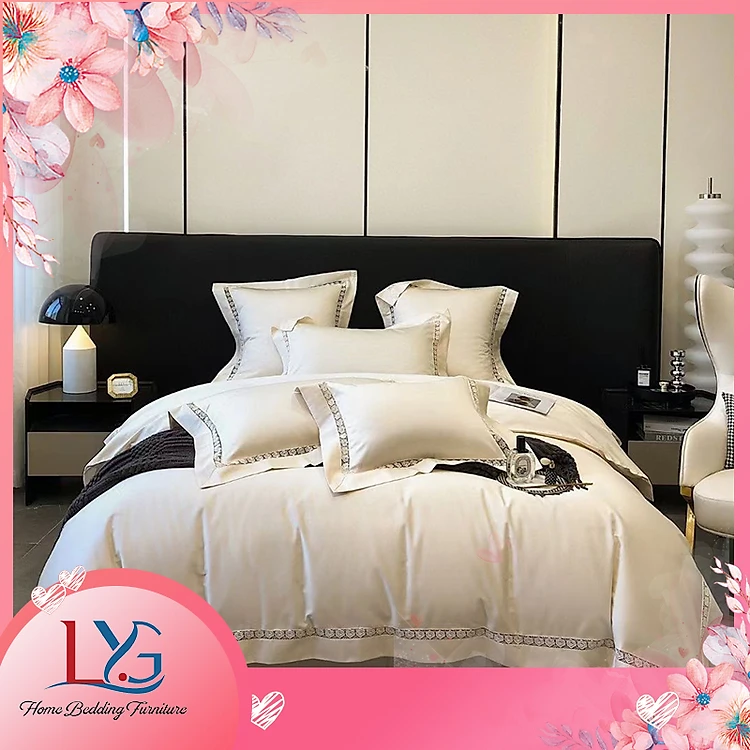 Set lụa 4 món thêu viền phong cách Nhật Bản LYG tặng thêm 02 ruột gối Micro cao cấp
