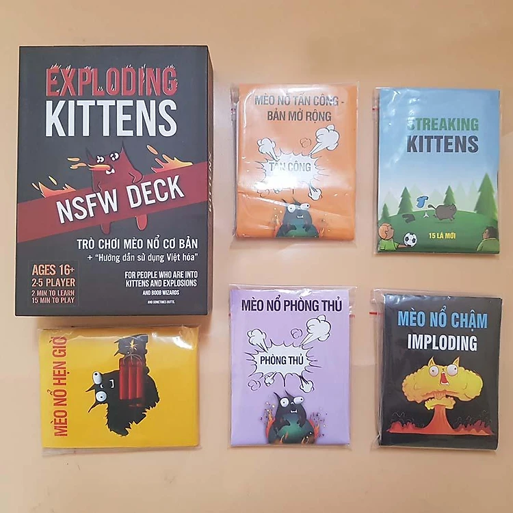 - Các bạn có thể chơi đến 8 người khi có các bản mở rộng chơi kèm. Luật chơi đơn giản Luật chơi của game xoay quanh lá bài "Exploding Kitten" (Mèo Phát Nổ) nằm trong số 56 lá.