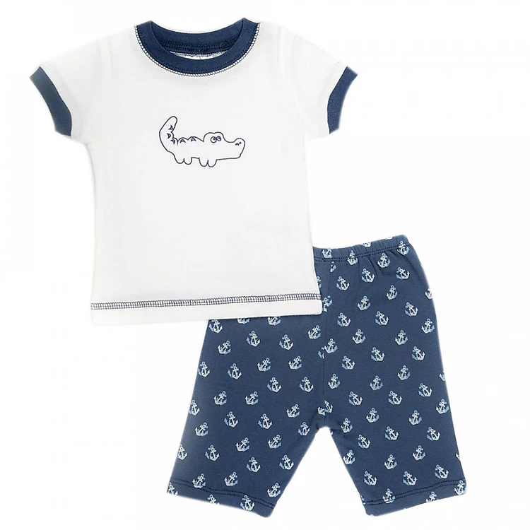 Set Pijama Tay Ngắn Cho Bé LullabyBaby NH03-14 - Trắng Viền Xanh Navy thiết kế áo được in hình cá sấu ngộ nghĩnh, ấn tượng. Quần có màu xanh Navy phối họa tiết mỏ neo đẹp mắt cho bé phong cách năng động hơn. Sản phẩm được may từ chất liệu vải Cotton bền và mềm mại nên bạn có thể yên tâm cho bé sử dụng.