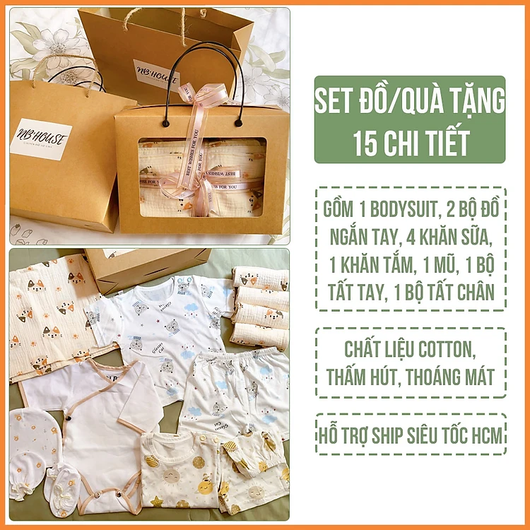 Set Quà Tặng Đồ Sơ Sinh Đầy Tháng 15 Chi Tiết Cho Bé Trai Và Bé Gái ( Gồm 3 Bộ Đồ, 1 Khăn Tắm Lớn, 4 Khăn Sữa, 1 Mũ, 1 Tất Tay, 1 Tất Chân)