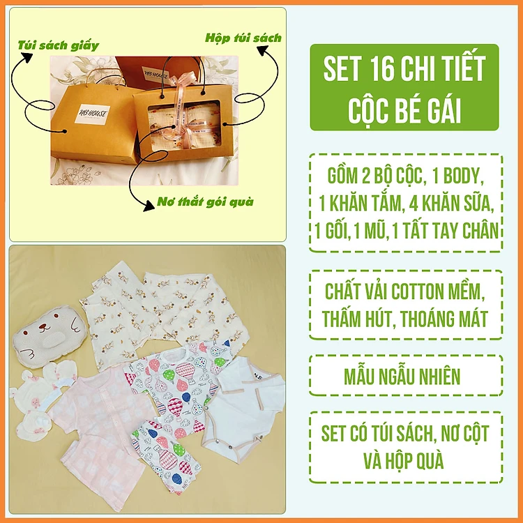 Set Quà Tặng Sơ Sinh Đầy Tháng 16 Chi Tiết Ngắn Tay Cho Bé Gái NB House Kids (Mẫu Ngẫu Nhiên)