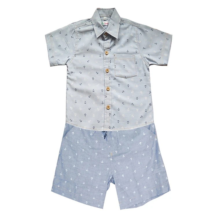 - Kiểu áo sơ mi với hàng nút cài chắc chắn, được thiết kế trên nền vải xám cùng họa tiết mỏ neo lạ mắt, đáng yêu.