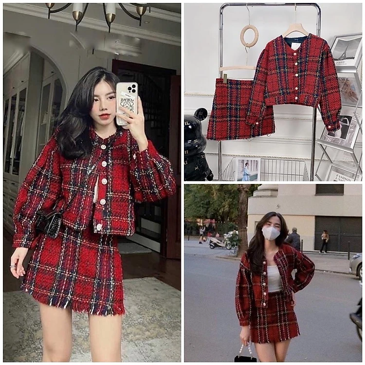 Sét Váy Dạ Kẻ Đỏ 2 Lớp Ulzzang Hàn Quốc, Sét Đồ Nữ Mùa Đông
