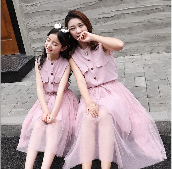 Set váy mẹ bé màu hồng sát nách cài khuy giữa + chân váy lưới TE2222 TE2223