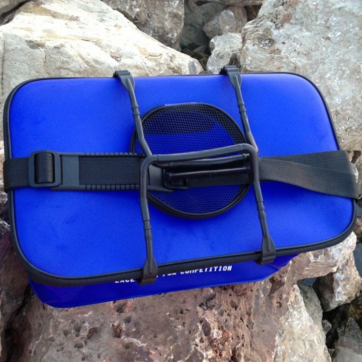 Nắp trên của thùng đựng cá có nắp dạng lưới để cá trao đổi oxy hoặc gắn sục khí giúp cá luôn sống trong quá trình đi câu