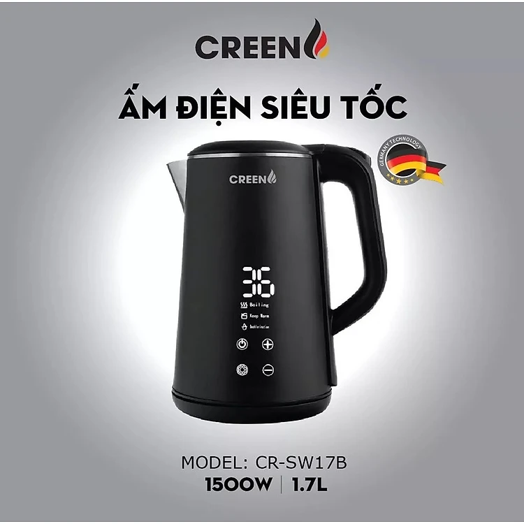 ( SIÊU PHẨM 2026 ) Ấm Siêu Tốc Khử Clo inox304 Creen CR-SW17B Dung Tích 1,7L Chuẩn Công Nghệ Đức - Điều Chỉnh Nhiệt Độ - Hàng Chính Hãng