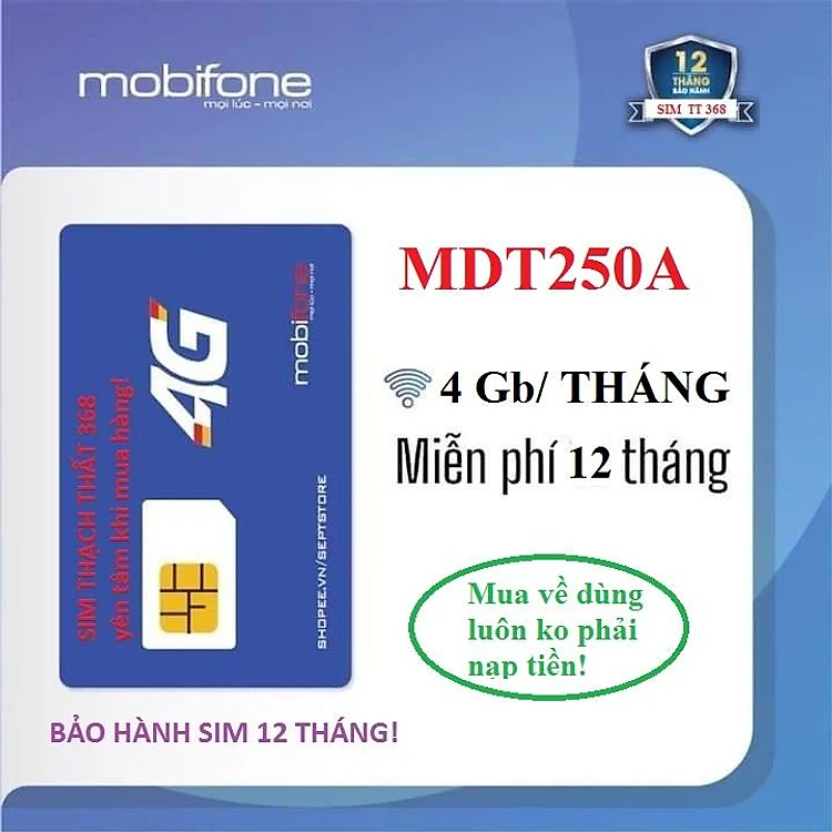 + sim 4g mobifone trọn gói 1 năm MDT250A giá thành rẻ phù hợp với rất nhiều nhu cầu sử dụng, đặc biệt thích hợp cho việc lắp dcom, lắp cammera hành trình, lắp làm sim phụ để dùng mạng dự phòng trên điện thoại