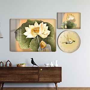 (CÓ ẢNH THẬT) Tranh đồng hồ hoa sen 4 bộ 3 tấm trang trí decor phòng bo viền kèm đinh treo