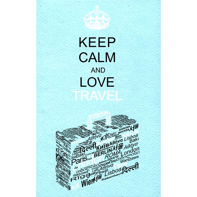 Bìa cứng từ giấy Kraft 270 có độ cứng chắc đặc biệt, hạn chế được sự cong vênh khi sử dụng trong thời gian dài. Bề mặt của bìa được in dòng chữ “Keep calm and love travel”, tổ hợp các địa danh, thắng cảnh hợp lại thành hình chiếc vali ngay bên dưới vô cùng đẹp mắt.
