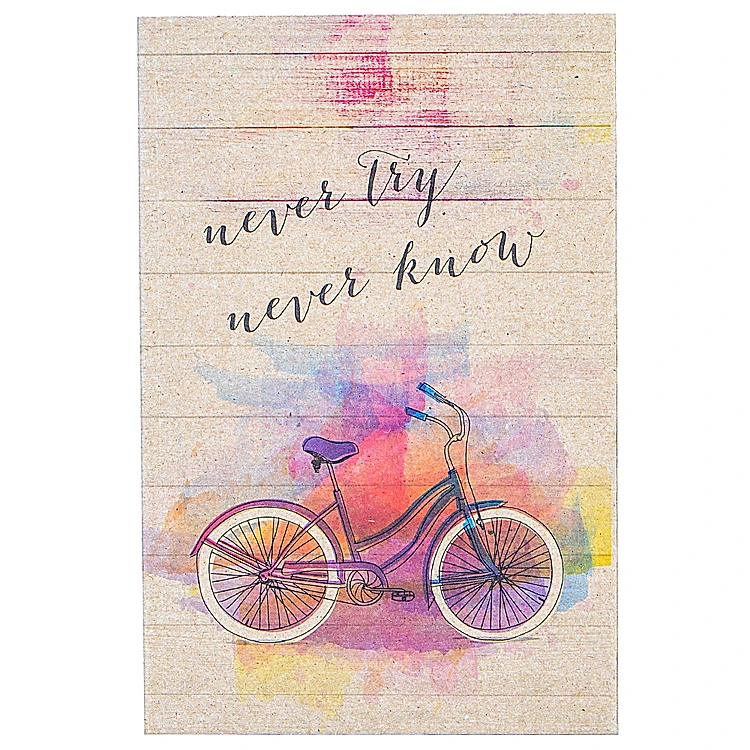 Mặt trước sổ là dòng chữ ý nghĩa “Never Try Never Know”, cùng hình ảnh chiếc xe đạp xinh xắn, được phối màu trông vô cùng tinh tế và trang nhã, đem đến cho chúng ta cảm giác nhẹ nhàng và tràn đầy ấm áp.