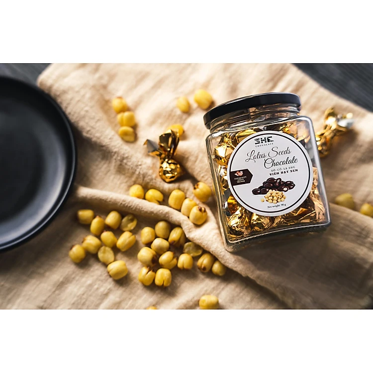 Socola viên Hạt sen - Hũ thủy tinh 90G - SHE Chocolate - Bổ sung năng lượng, đa dạng vị giác. Quà tặng sức khỏe, quà tặng người thân, dịp lễ, thích hợp ăn vặt