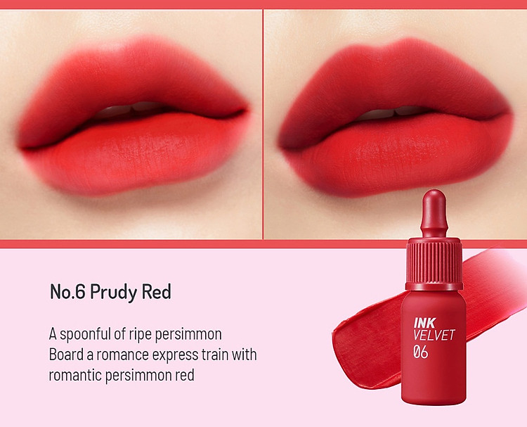 Chất son của dòng Peripera Ink Velvet không hề giống những loại son kem lì thông thường bởi chất son đã được cải tiến kết hợp ưu điểm của son kem lì và son tint. Chính vì vậy, Peripera Ink Velvet sở hữu chất son xốp mịn, lên môi mượt và rất đều màu. Tuy son có lớp matte finish nhưng không hề gây khô môi mà vẫn giữ được độ mềm mại tuyệt vời. Lớp son mỏng nhẹ không hề làm lộ vảy môi hay gây nặng môi, đưa đến đôi môi tươi tắn tự nhiên. Khả năng lên màu của son cũng rất tuyệt vời khi nó có khả năng che phủ những khuyết điểm môi như màu môi tái hay viền môi sậm màu.