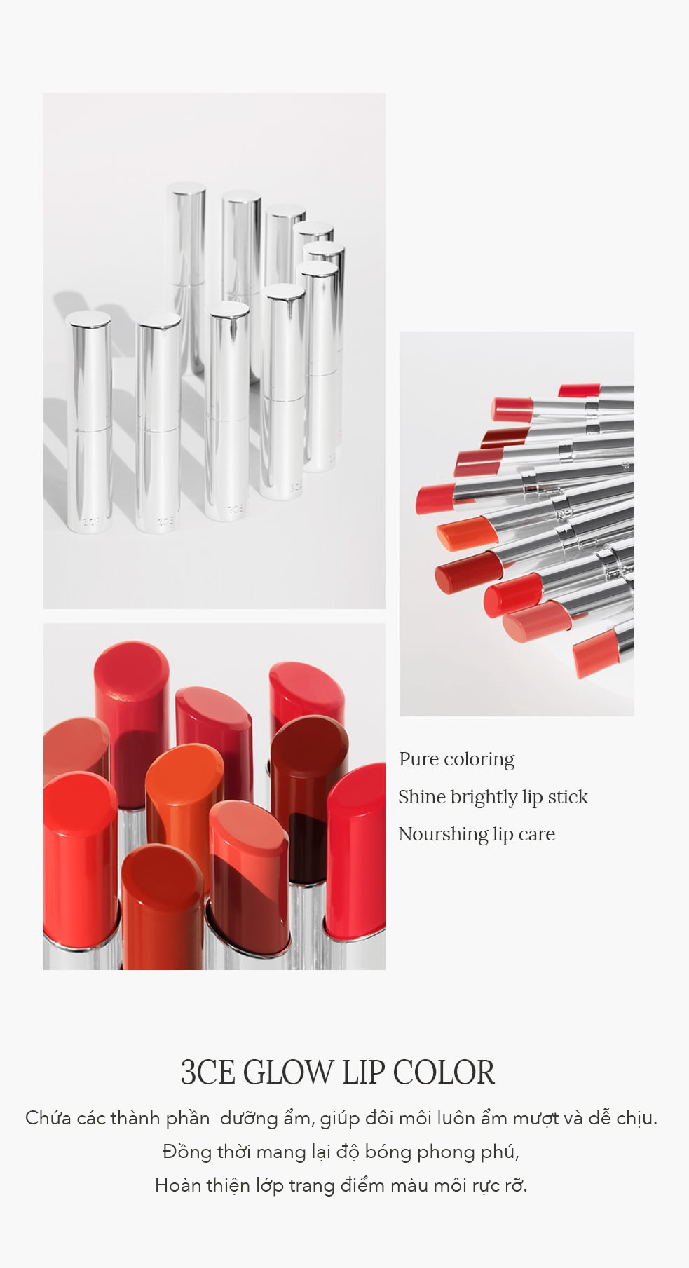 - Son Thỏi Màu, Dưỡng Ẩm Cho Đôi Môi Mềm Mại Căng Bóng 3CE Glow Lip Color có chất liệu son mềm và nhiều dưỡng, cải thiện tình trạng nếp nhăn và rãnh môi, giúp bờ môi căng bóng mọng cùng với những tông màu đẹp.