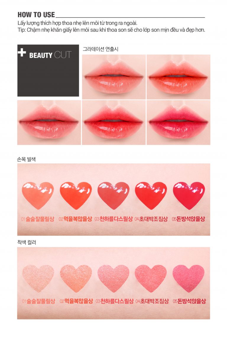 Son bóng với cảm nhận môi căng bóng và độ ẩm cao dễ chịu và thoải mái, che giấu hiệu quả các khuyết điểm môi, giữ màu lâu như lúc mới thoa và không bị biến đổi màu.