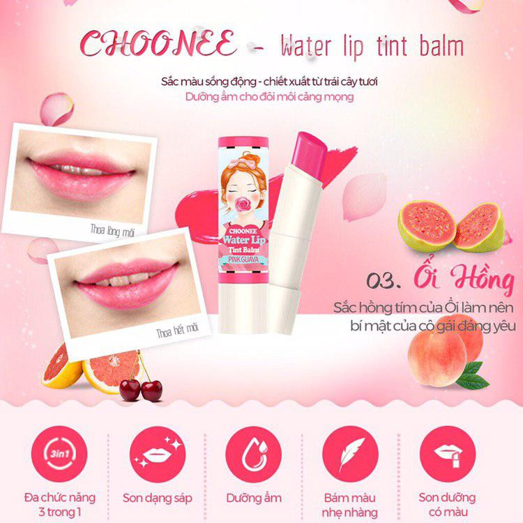 Choonee Water Lip Tint Balm có 4 màu cherry, raspberry, pink guava và grape fruit với sắc đỏ tươi tắn phù hợp với sắc tố da người Việt Nam, mùi hương dễ chịu lắm đấy.