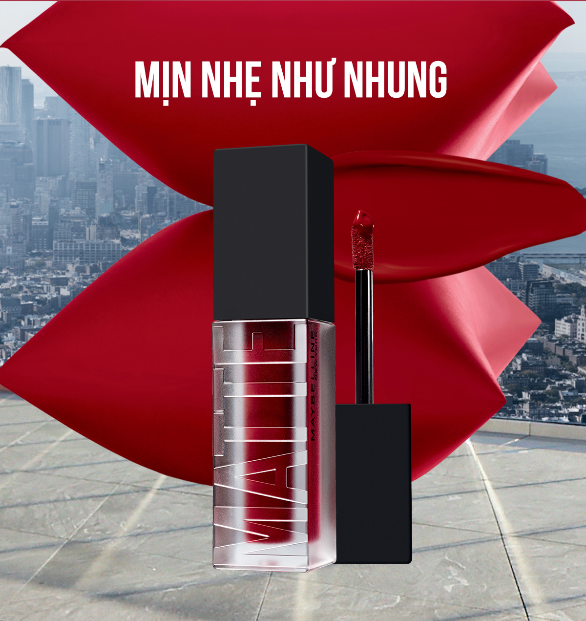 Lấy cảm hứng từ Cushion - /chiếc gối nhỏ/ /ấp ôm nâng niu/, Maybelline tạo nên một định nghĩa hoàn toàn mới về dòng son kem lì với công nghệ đột phá Hiệu ứng lì đa chiều - dimensional matte, tạo không gian nhiều sắc độ, chiều sâu, hút trọn sắc son rồi bung ra ôm ấp lấy bờ môi xinh xắn của người châu Á.
