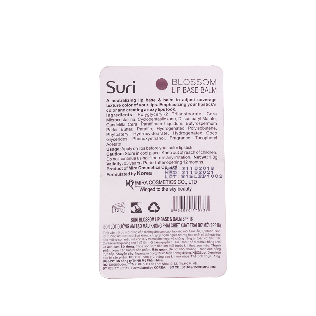 Tinh dầu trái bơ mỡ cung cấp dưỡng ẩm cực cao, tạo sắc môi tươi tắn, tự nhiên. Son lót dưỡng ẩm tạo màu Suri không chỉ giúp ngăn ngừa những hóa chất có thể gây hại cho môi từ son màu mà còn duy trì môi ẩm mượt và chống nắng an toàn với SPF 18. Có thể kết hợp cùng son lì để làn môi thêm quyến rũ.