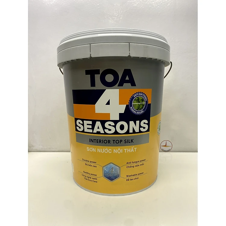 Sơn Nước nội thất Toa 4 Season top silk dễ lau chùi được chế tạo từ nhựa nhũ tương, với công nghệ sơn nước cao cấp, chất lượng tốt, độ phủ cao, bề mặt nhẵn mịn, có khả năng chống nấm mốc cao, có màu sắc bền đẹp. Công thức không chứa Chì, Phoóc-môn, APEO... an toàn cho sức khoẻ và môi trường.