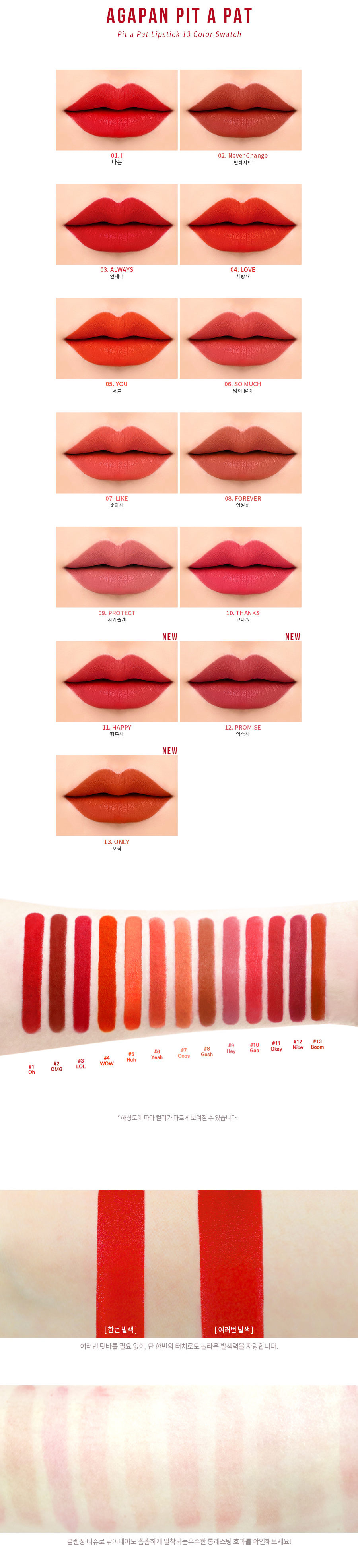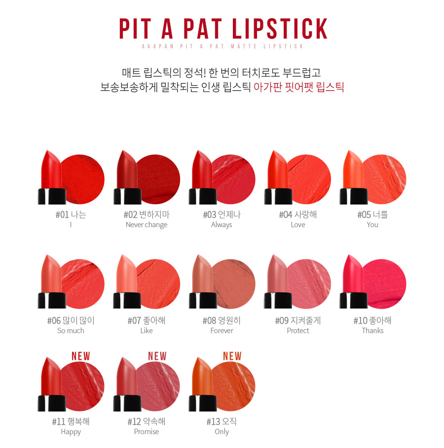 Son thỏi lì Agapan Pit A Pat Matte Lipstick (Phiên bản mới 2017) có đến 13 màu son (gồm 10 màu son như phiên bản trước và 3 màu son mới) để các nàng tha hồ làm điệu cho đôi môi của mình: