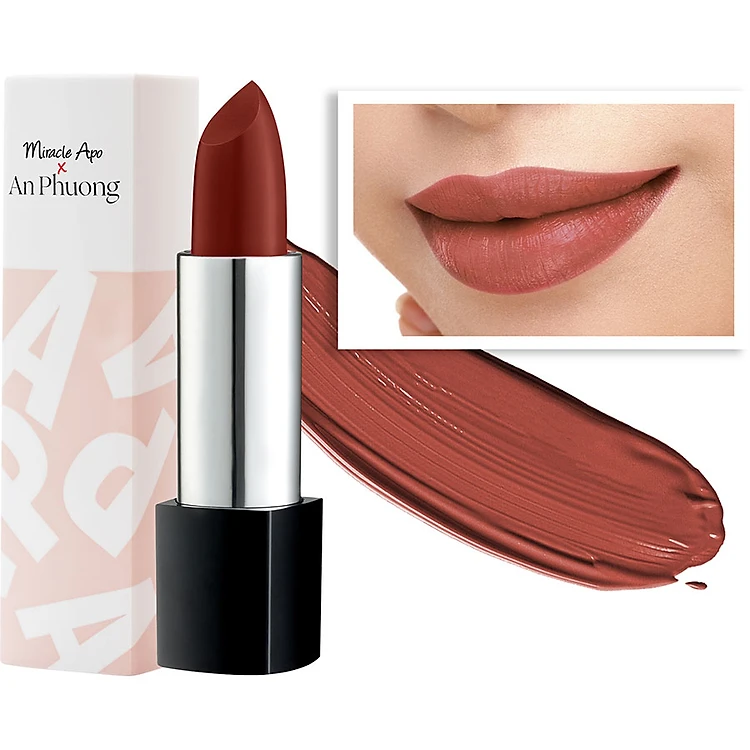 - Son thỏi Miracle Apo x An Phương có tên 26 với tone màu Cam đỏ gạch cùng chất liệu Silky Satin tạo hiệu ứng mịn mượt như nhung cho đôi môi của các cô nàng. Đây chắc chắn sẽ là sự lựa chọn tuyệt vời cho các cô nàng hiện đại và cá tính.