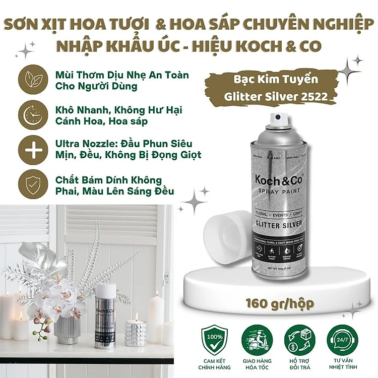 Sơn Xịt Màu Hoa Tươi Màu Bạc Chuyên Nghiệp Cho Florist, Decor Sự kiện nhập khẩu Úc Hiệu Koch & Co - Khô nhanh, Không Lem, Mùi Thơm Dịu an toàn