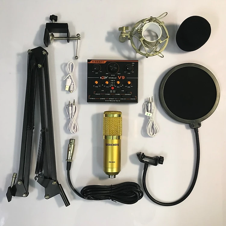 BỘ SOUND CARD V9 gồm 1. Card Âm Thanh V9 2. Dây cáp nguồn 3. Dây 3.5 kết nối  4. Dây live stream 3.5