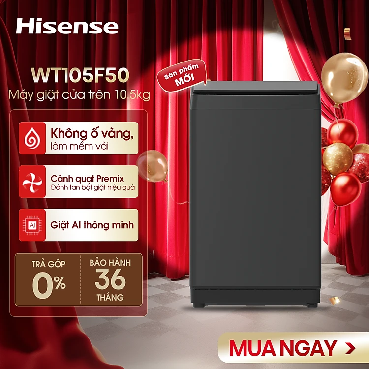 |SP MỚI 2025| Máy giặt Hisense Inverter 10.5kg WT105F50 Giặt AI, Mềm vải sạch sâu, Bảo hành 3 năm - HÀNG CHÍNH HÃNG