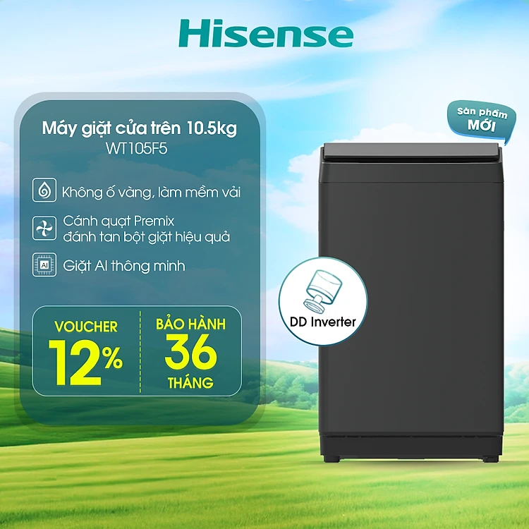 |SP MỚI 2025| Máy giặt Hisense Inverter 10.5kg WT105F50 Giặt AI, Mềm vải sạch sâu, Bảo hành 3 năm - HÀNG CHÍNH HÃNG
