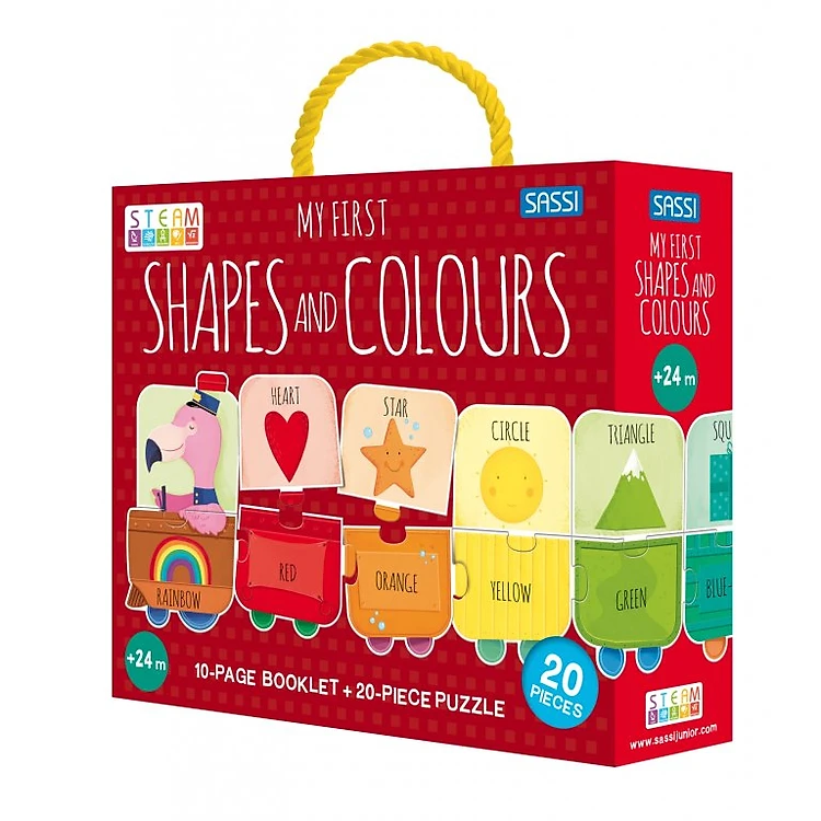 A 10-page book and a giant 20-piece puzzle to create a toy train and learn shapes and colours.