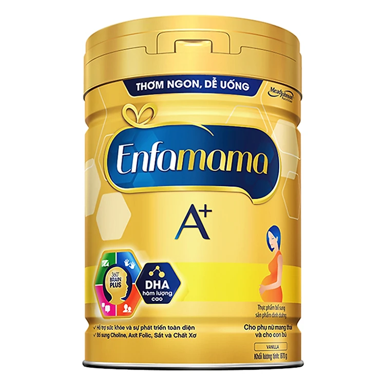 - Sữa Bầu Enfamama A+ - Hương Vani (870g) cung cấp hàm lượng cao DHA, giúp trí não bé phát triển toàn diện ngay trong bụng mẹ.