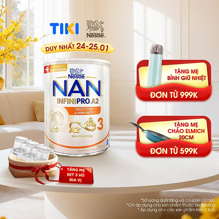 Sữa bột NAN INFINIPRO A2 800g Thụy Sĩ 3 với đạm quý A2 tiêu hóa tốt sau 7 ngày và 6HMO tăng cường đề kháng + Tặng Set 3 hũ nha vị (2 - 6 tuổi)