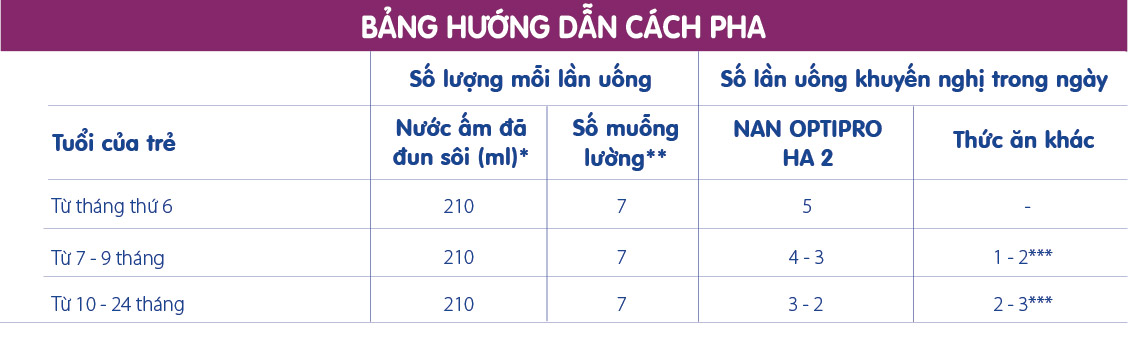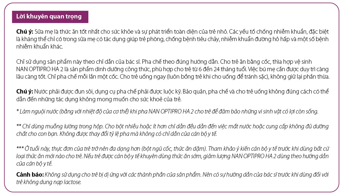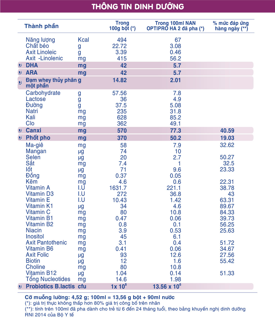 - Đạm OPTIPRO HA: Là công nghệ độc quyền của Nestlé chứa đạm Whey thủy phân một phần được chứng minh khoa học giúp phòng ngừa nguy cơ dị ứng cho những năm đầu đời của trẻ.