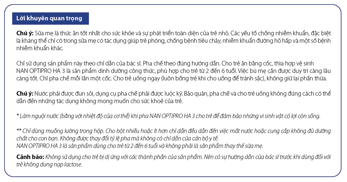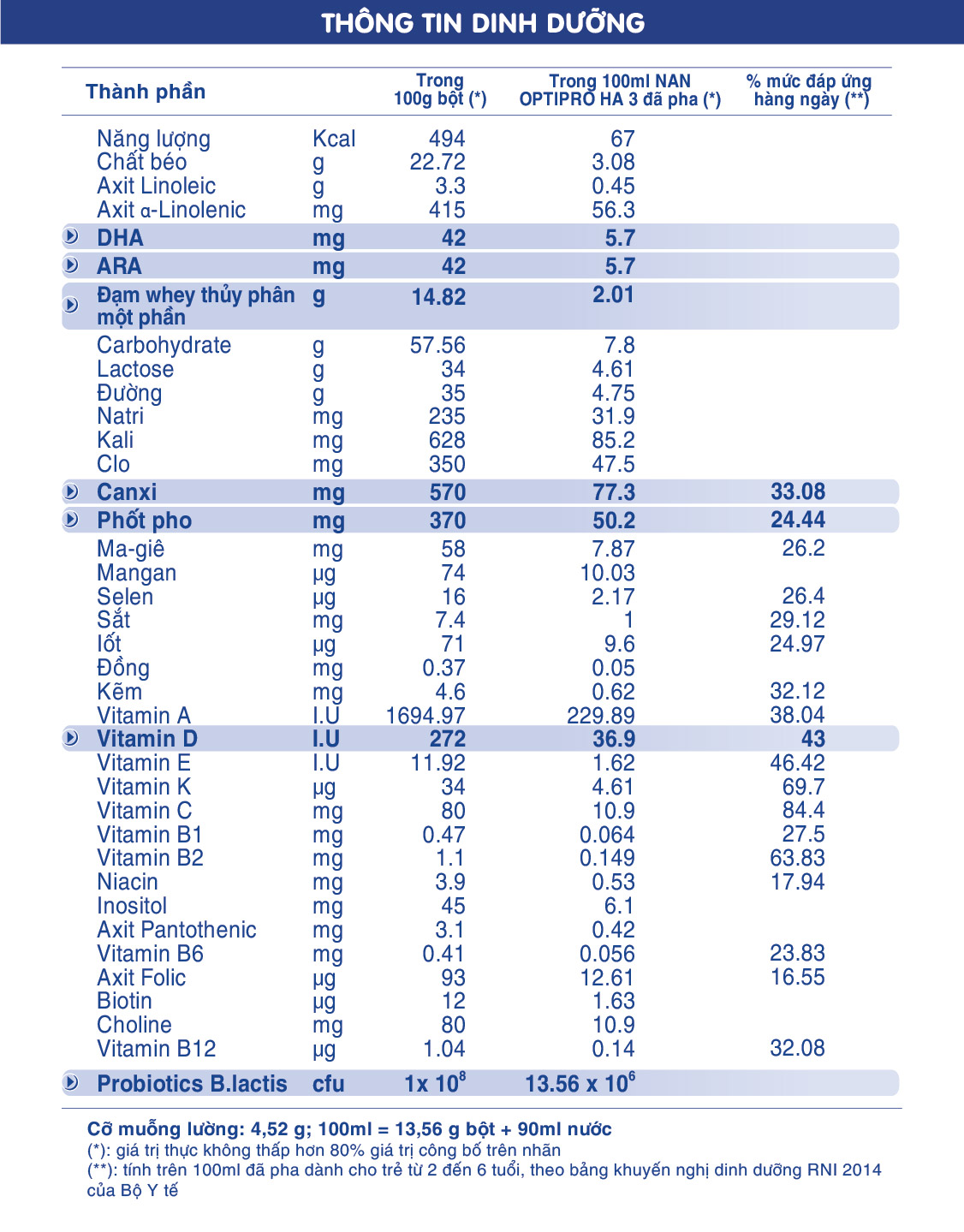 - Đạm OPTIPRO HA: Là công nghệ độc quyền của Nestlé chứa đạm Whey thủy phân một phần được chứng minh khoa học giúp phòng ngừa nguy cơ dị ứng cho những năm đầu đời của trẻ.