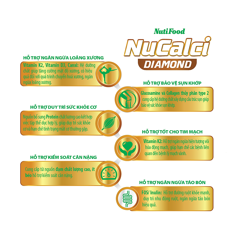NuCalci Diamond là dòng sản phẩm được nghiên cứu và phát triển bở các Chuyên Gia Dinh Dưỡng NutiFood với công thức Bone Nutrition là sự kết hợp của bộ ba dưỡng chất Vitamin K2, Canxi và Vitamin D3 giúp hệ xương chắc khỏe từ bên trong, hỗ trợ ngăn ngừa loãng xương. Cùng với hệ dưỡng chất Glucosamine và Collagen thủy phân type 2 hỗ trợ bảo vệ và duy trì sức khỏe sụn khớp.