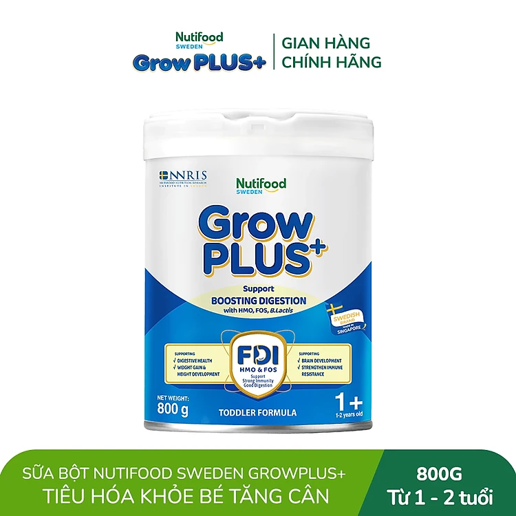 Sữa bột Nutifood Sweden GrowPLUS+ Tiêu Hóa (Xanh Nhạt) 1+ - Tiêu hóa khỏe, tăng cân (Lon 800g)