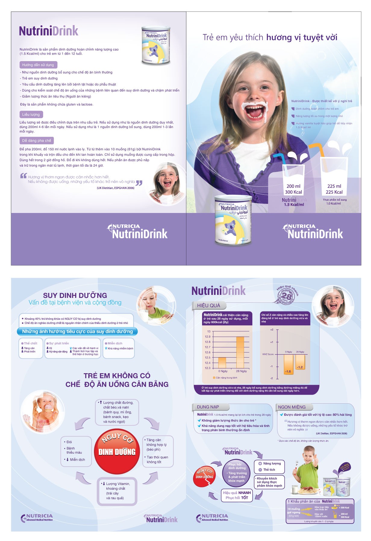 1.2 Đối với trẻ suy dinh dưỡng hoăc nguy cơ suy dinh dưỡng thường không ăn được lượng lớn thức ăn nên đòi hỏi Thiết kế sản phẩm giàu dinh dưỡng (ít mà chất). Vì vậy sản phẩm Nutrinidrink là công thức sáng tạo duy nhất trên thị trường dinh dưỡng cho bé cung cấp 1.5 kcal/ml (lưu ý: Đây là công thức pha chuẩn). Sử dụng 2 ly 200ml sẽ cung cấp 600 kcal/ngày giúp trẻ bắt kịp đà tăng trưởng.