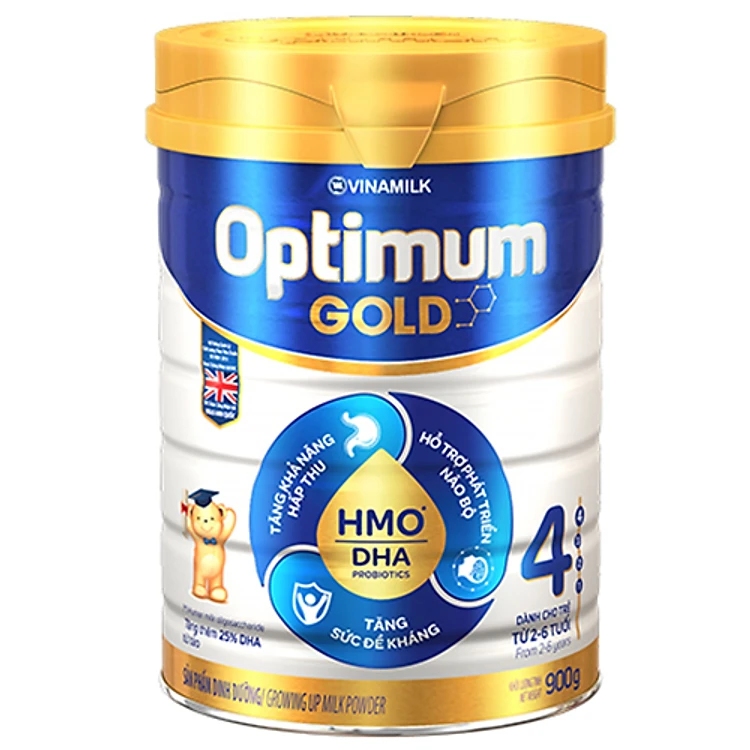 Sữa Bột Vinamilk Optimum Gold 4 Hộp Thiếc (900g) mới, chất lượng được công nhận bởi UKAS - Anh Quốc, với công thức để hấp thu này được bổ sung thêm 20% DHA từ tảo tinh khiết, kết hợp cùng Lutein giúp trẻ phát triển não bộ vượt trội, tăng khả năng nhận thức và học hỏi.