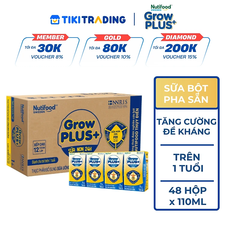 Thùng sữa bột pha sẵn Nutifood GrowPLUS+ Sữa Non Tăng Đề Kháng 1+ (48 hộp x 110ml)