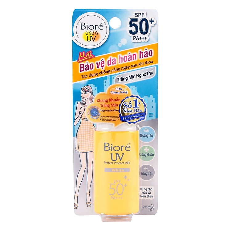 - Sữa Chống Nắng Bảo Vệ Da Hoàn Hảo Biore Trắng Mịn Ngọc Trai (Tuýp 25ml) với công thức đặc biệt không chỉ có tác dụng chống nắng hiệu quả và kéo dài, mà còn bảo vệ da khỏi vi khuẩn từ môi trường cùng công thức Vitamin và bột ngọc trai giúp da trắng sáng, mịn màng tự nhiên.
